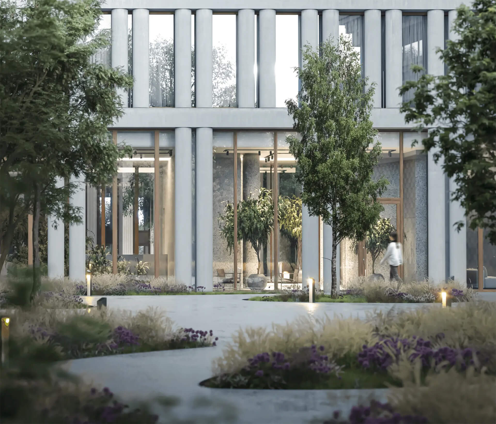 Пространство вокруг MONO Kami спроектировано с учетом принципов уединения и комфорта. Озелененный двор-сад с мягкой подсветкой и вымощенными камнем дорожками создает атмосферу спокойствия и умиротворения.