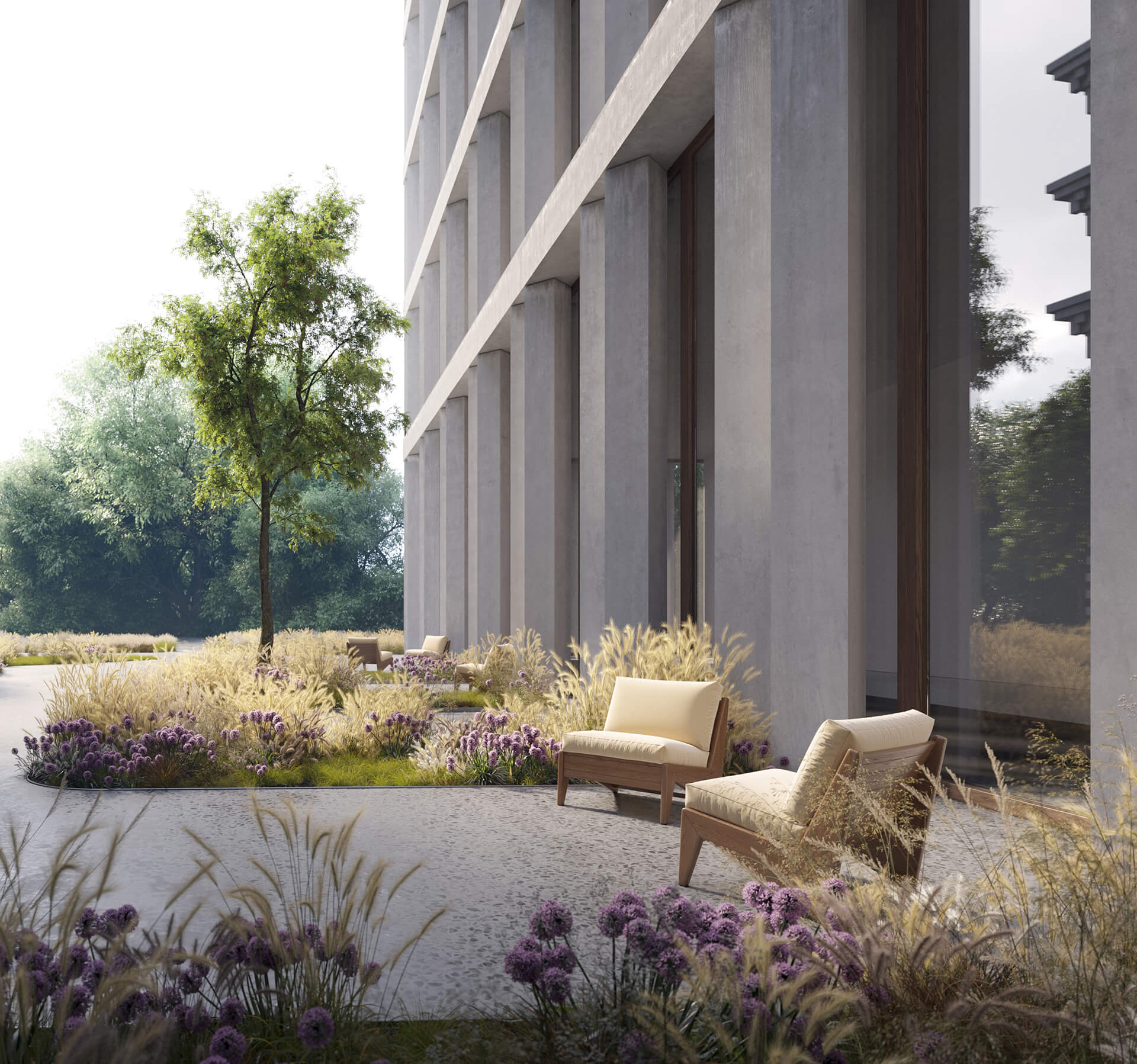 Ландшафтный дизайн включает в себя многолетние травы и цветы, а также уютные зоны отдыха, где жители могут наслаждаться природой в центре города.