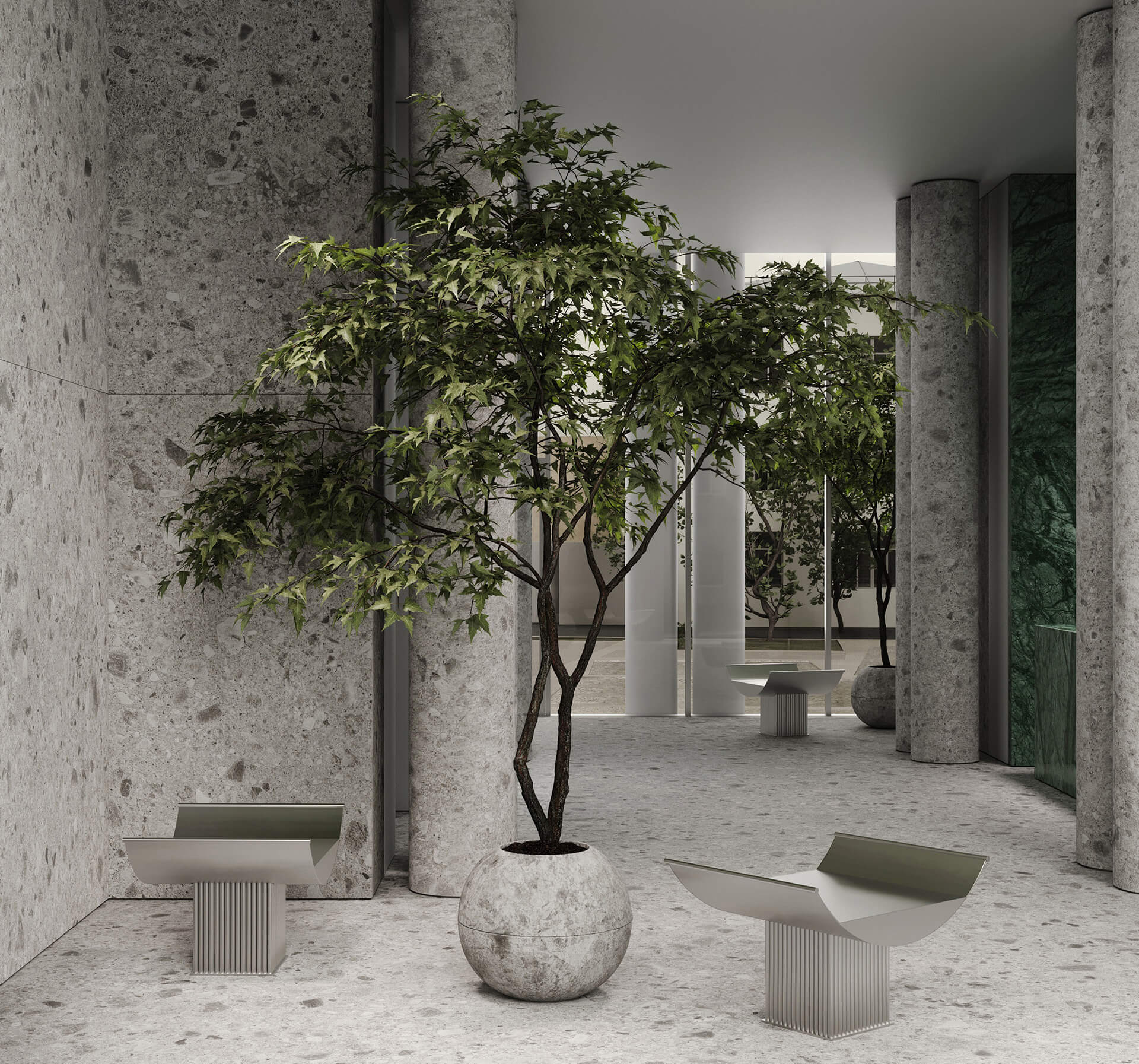 Геометрические элементы колонн с фасада повторяются в интерьере лобби, создавая единую архитектурную концепцию и подчеркивая внимание к деталям.